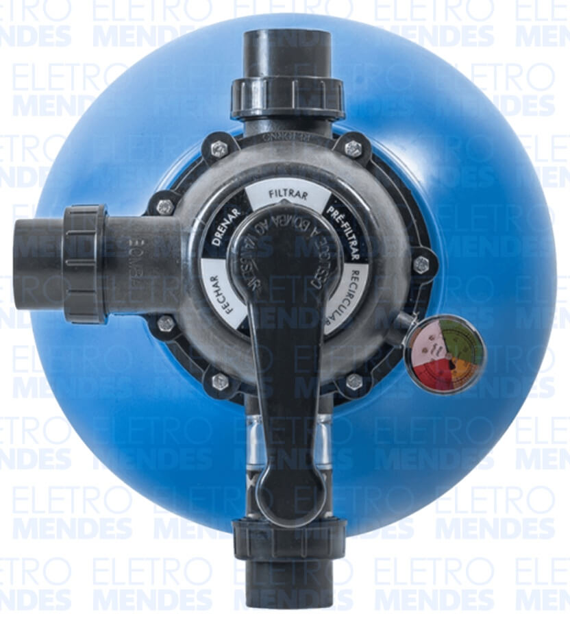 A válvula seletora contém 6 posições: recircular, filtrar, drenar, retrolavar, prefiltrar e fechar. Inclui o visor de retrolavagem e manômetro.