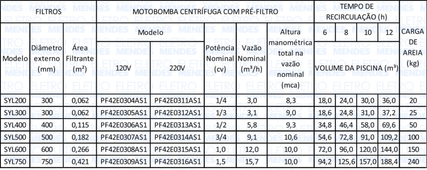 Os dados apresentados na tabela a seguir são fornecidos para a seleção da motobomba, do filtro e da quantidade de areia necessária. Verifique o volume máximo das piscinas em função do tempo de recirculação.